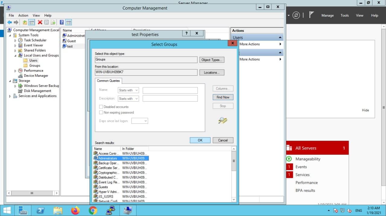 سپس در این مرحله find now را کلیک میکنیم و از دسترسی های مختلفی که نمایش داده میشود دسترسی مورد نظر خودمان را انتخاب میکنیم و تمامی پنجره های باز را ok میکنیم تا یوزر مورد نظر دسترسی ها لازمه را بدست آورد.