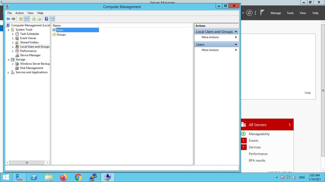 2- در computer managment گزینه local users and groups را انتخاب نمایید و وارد پوشه users شوید