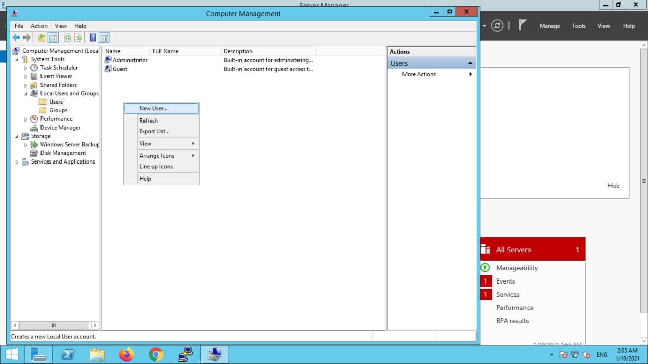 3- بعد از وارد شدن به پوشه users کلیک راست نمایید و بروی گزینه new user کلیک نمایید
