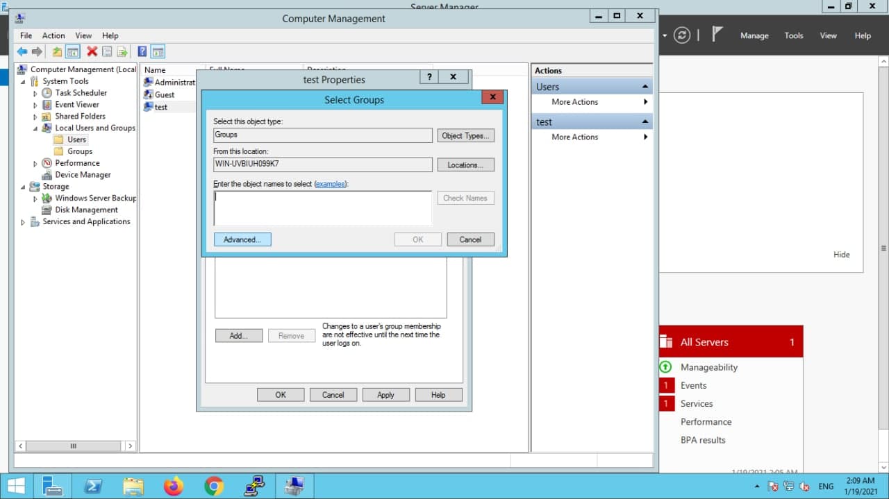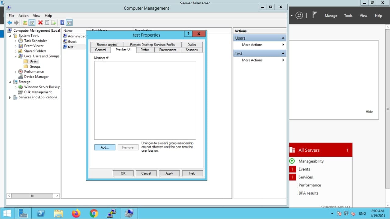 5- بعد از ایجاد یوزر مورد نظر نیاز به تنظیم دسترسی های لازمه برای یوزر میباشد بر روی یوزر کلیک راست نمایید و وارد properties یوزر مورد نظر شوید و از تب های بالا بروی member of کلیک نمایید و add را انتخاب نمایید